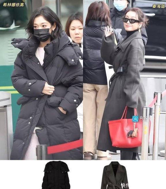 希林娜依高穿的黑色长款羽绒服显得很厚实;秦海璐则选了一款束腰大衣,但看起来稍显单薄。保暖性没那么强。张钧甯那件外套造型普通,但上身效果很好。